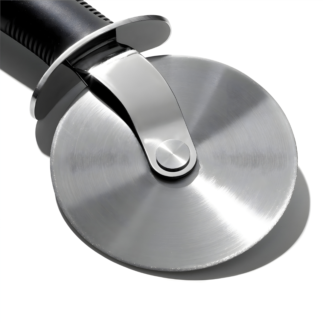 The OXO Good Grips New Large 4-Inch Pizza Cutter is designed for effortless slicing of even the thickest foods. It features a large, sharp stainless steel blade that easily cuts through deep dish or thick-crust pizza, as well as quesadillas, pie crusts, and brownies.